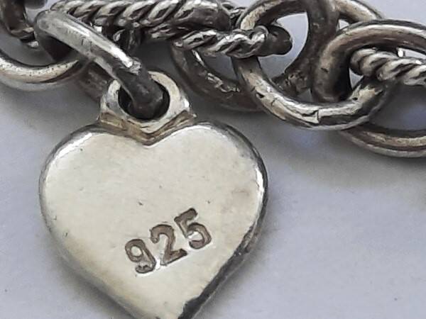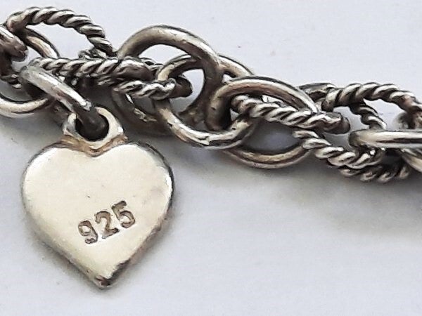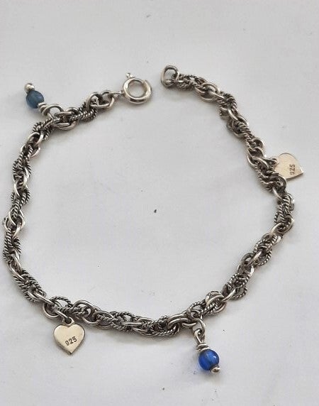 De armband heeft een klassiek gedraaid (touw) ontwerp en is versierd met twee hartvormige bedels en twee sierlijke blauwe kraaltjes.