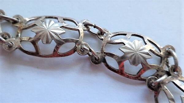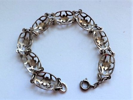 Vintage zilveren filigraan armband met opengewerkte ovale schakels.