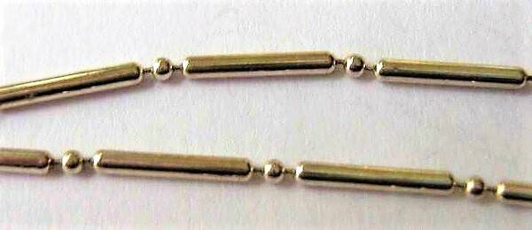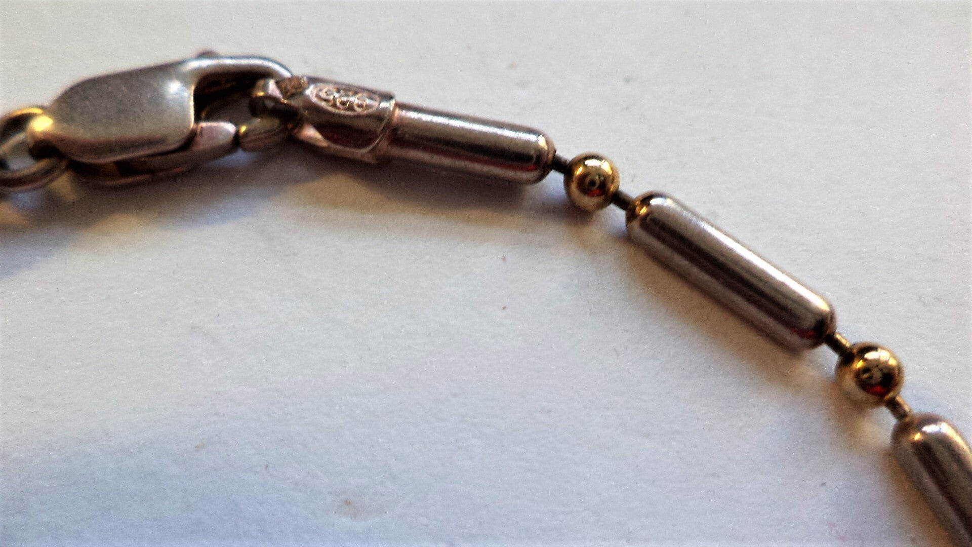 De armband is vakkundig vervaardigd uit sterling zilveren staafjes, afgewisseld met goudkleurige (vergulde) bolletjes.