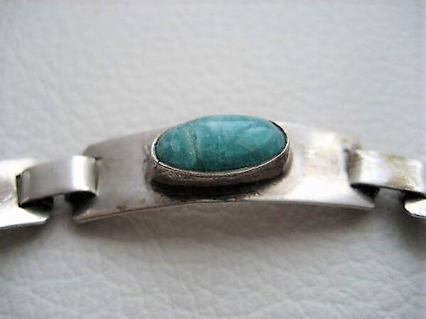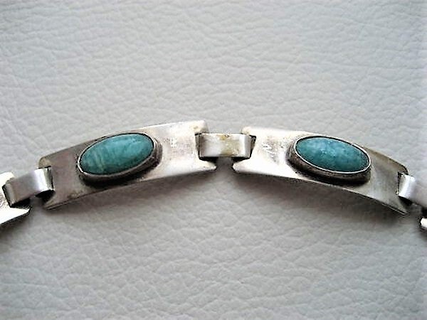 Sierlijke zilveren armband bezet met vijf natuurlijke amazonieten.