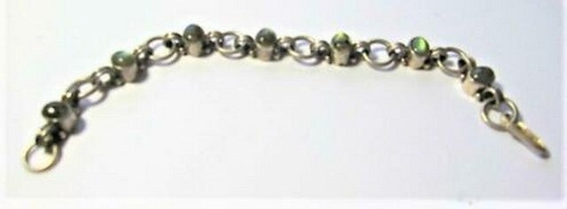 Prachtige, robuuste en handgemaakte schakelarmband met zeven ovale, cabochon geslepen labradoriet stenen.