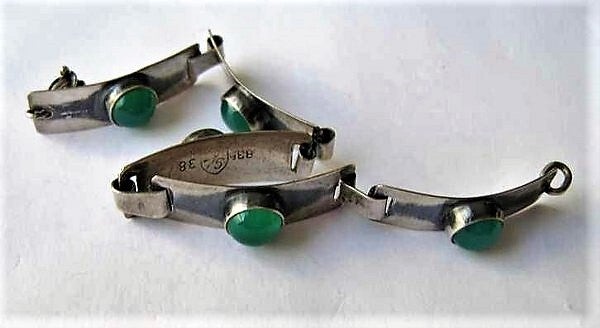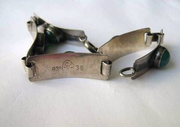 De armband bestaat uit robuuste, afwisselende zilveren schakels en schakels met ingezette, ovale groene cabochons, hoogstwaarschijnlijk agaat of chrysopraas.