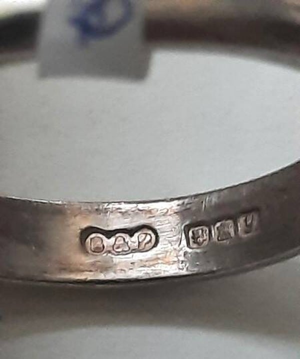 7810-3Leuke zilveren ring met kleine amethistGemerkt B&P staande leeuw, gebouw, jaarletter yKop ca. 13 x 7 mm,Maat 17In prima staat