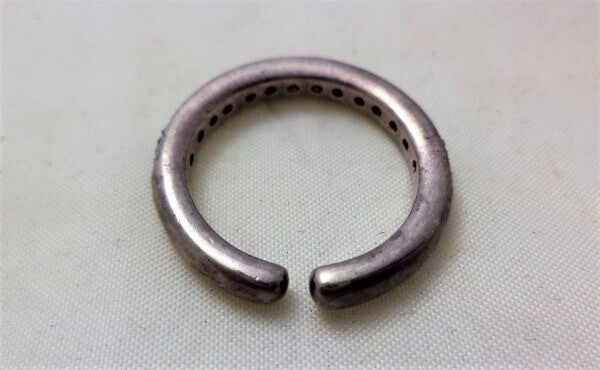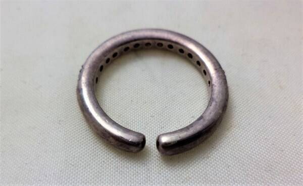 Stevige oude zilveren ring met 14 zirkonia open.Gemerkt 925.Maat 18.In prima staat.