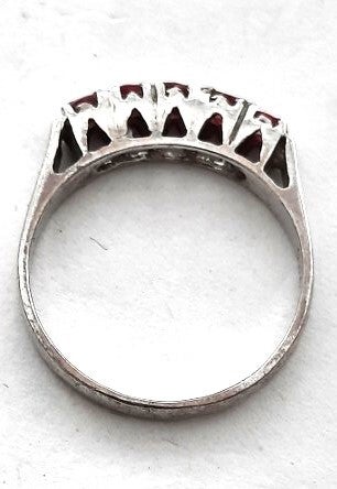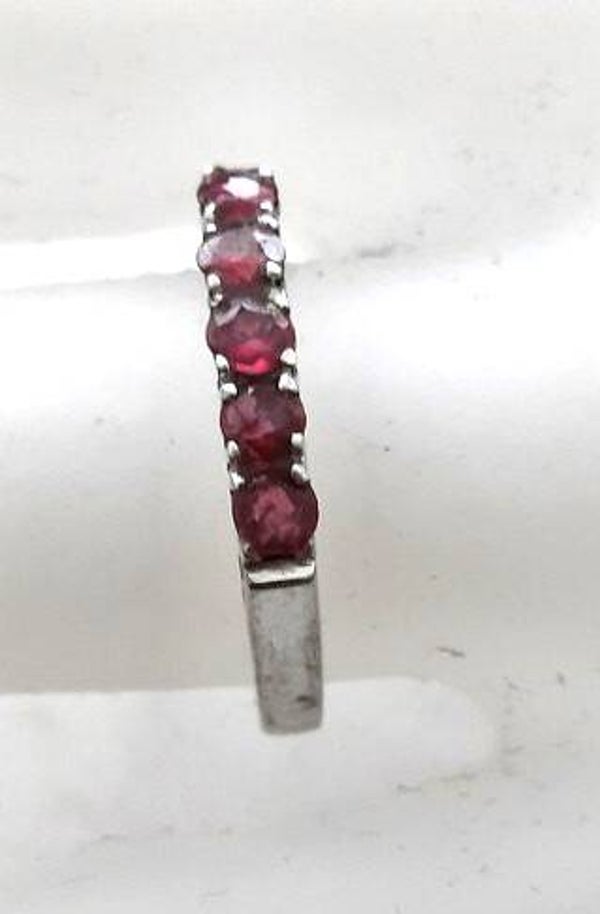 Fijne zilveren ring bezet met meerdere fonkelende rode steentjes (Rodoliet?) in een elegante rijzetting.