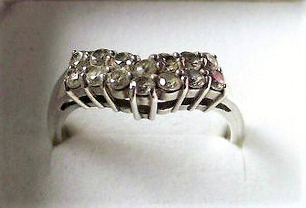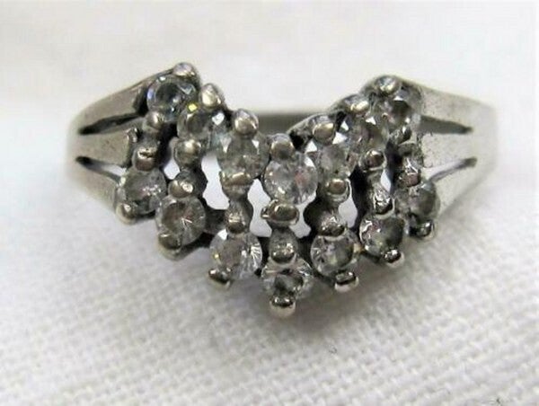 Elegante zilveren ring, bezet met meerdere fonkelende zirkonia’s in een speelse V-vorm.