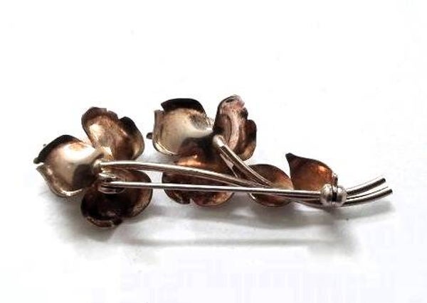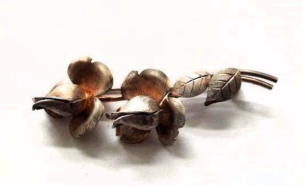 Een zeer elegante, vintage bloemenbroche in de vorm van twee gedetailleerde rozenknoppen op een steel met bladeren.