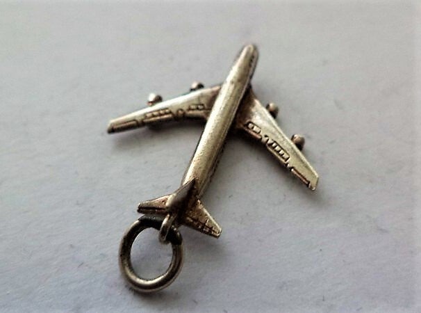 Prachtige, gedetailleerde vintage bedel, hanger in de vorm van een passagiersvliegtuig (jumbojet/Boeing 747).