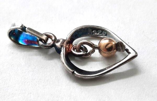 In het midden van het zilveren hart hangt een klein bolletje met een warme roségouden/gouden gloed, wat zorgt voor een stijlvol contrast.