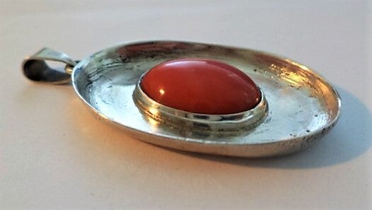 Centraal in de hanger bevindt zich een grote, ovaal geslepen cabochon van bloedkoraal met een diepe, warme kleur.