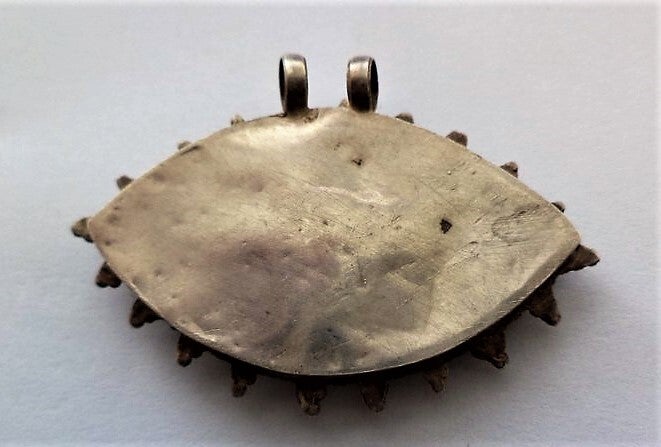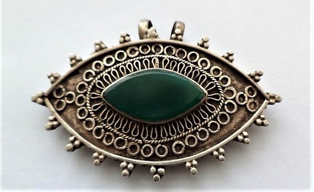 Dit sieraad is uitgevoerd in een oogvormig model met een centrale, marquise-geslepen groene edelsteen, waarschijnlijk groene onyx of chalcedoon.