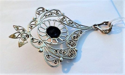 Grote antieke filigrain zilveren hanger met onyx (7924-5292)