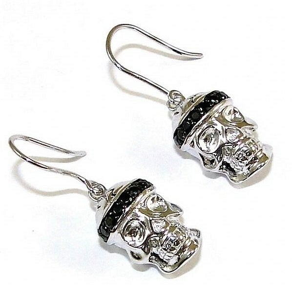 Zilveren oorbellen doodshoofd met hoofdbandje van briljant geslepen zwarte zirkonia.