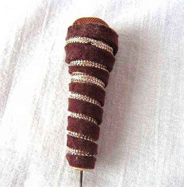De kegelvormige kop (6,5 x 1,8 cm) is bekleed met een diepbruine, fluweelachtige stof en elegant gedecoreerd met gewikkeld goudkleurig metaaldraad.