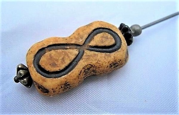 De speld is voorzien van een robuuste, organisch gevormde kraal waarin een oneindigheidssymbool (lemniscaat) is gegraveerd.