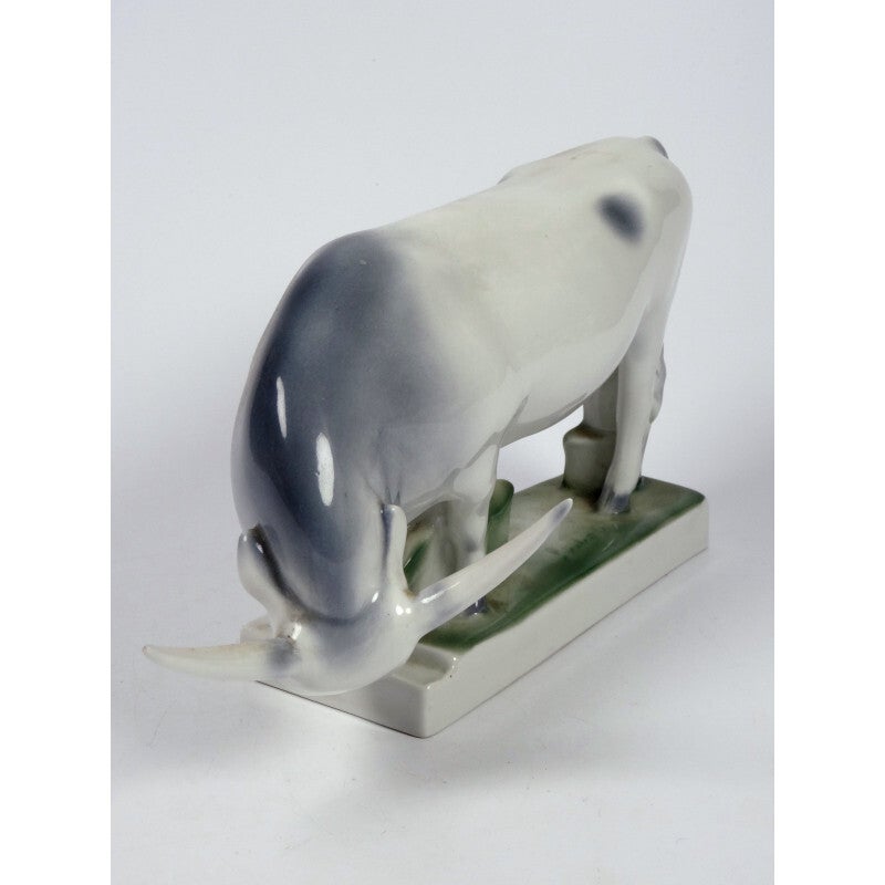 Zsolnay - Groot antiek porseleinen beeld. Hongaars grijs rund. András Sinkó