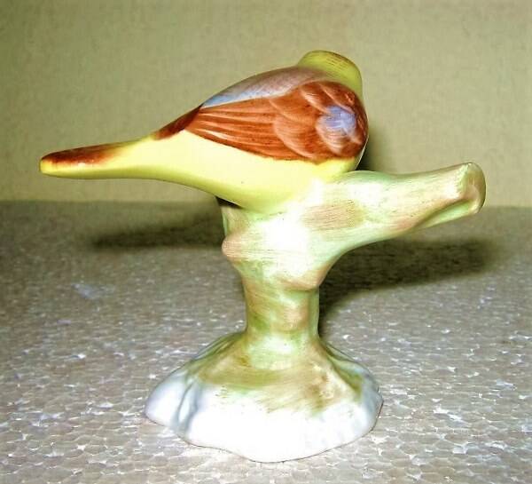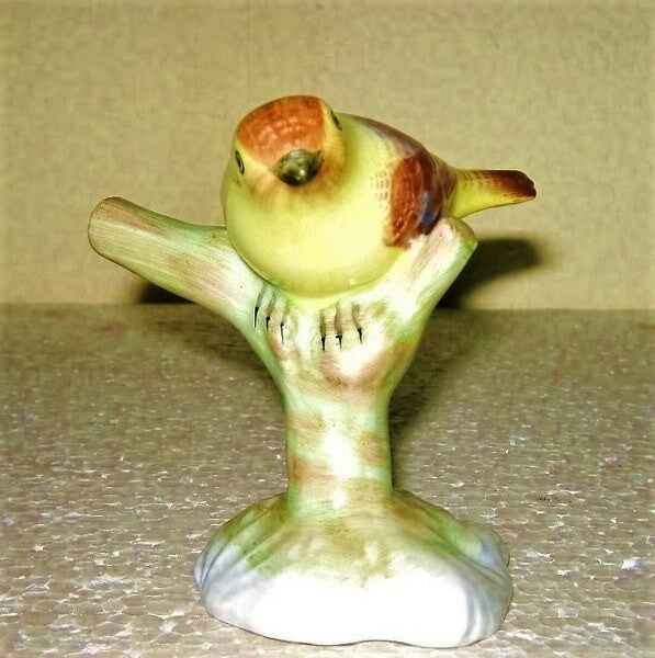 Prachtig gedetailleerd en handgeschilderd porseleinen beeldje van een vogel op een boomstam.