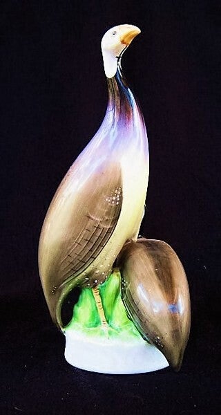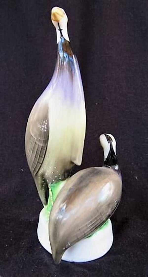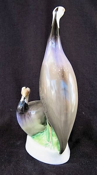 Elegant en gestileerd porseleinen beeldje van twee parelhoenders (guinea fowls), vervaardigd door de gerenommeerde Hollóháza fabriek in Hongarije.