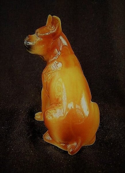 Het betreft een zittende boxer (of Franse bulldog), uitgevoerd in een warme geelbruine kleur met een karakteristiek zwart masker op de snuit.