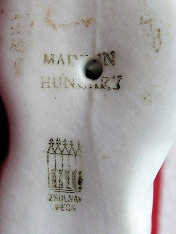 Dit verfijnde figuurtje is vervaardigd door de befaamde Zsolnay-fabriek in Pécs, Hongarije.