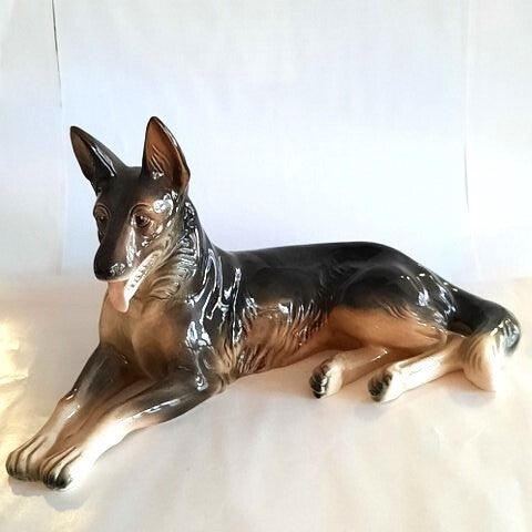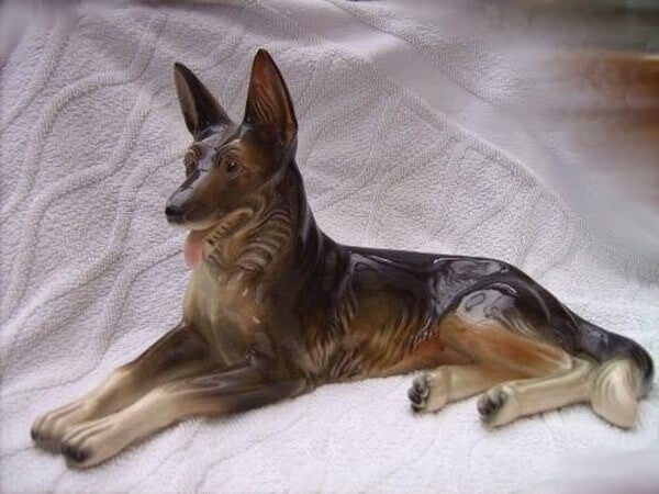 Prachtig en gedetailleerd vintage porseleinen beeld van een liggende Duitse Herder, vervaardigd door de gerenommeerde Duitse fabrikant Hertwig Katzhütte (Thüringen).