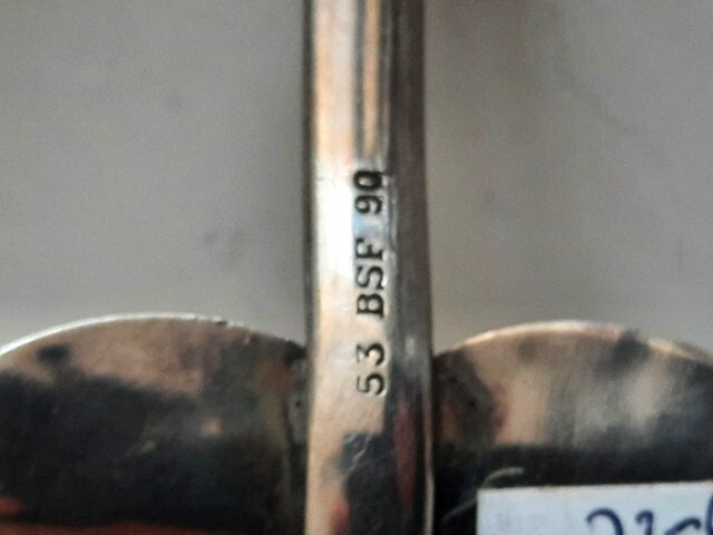 Dit specifieke model (53 BSF 90) kenmerkt zich door een prachtig gehamerd blad en een sierlijke, gekrulde handgreep.