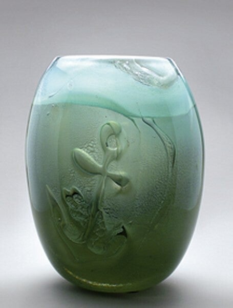 There he was able to freely develop aesthetically alongside extensive work in designing utilitarian glass, to experiment with forms and colours and try out recently discovered techniques.