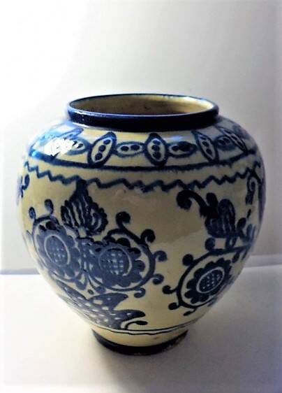 Prachtige antieke Hongaarse aardewerk vaas met een klassiek blauw-wit decor.