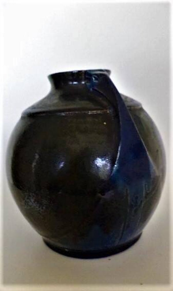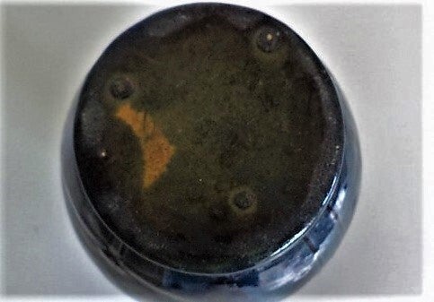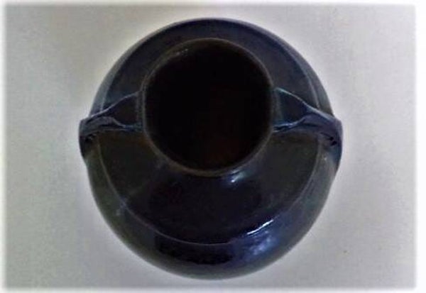 Deze karakteristieke bolle vaas is uitgevoerd in een diep donkerblauw/zwart glanzend glazuur.