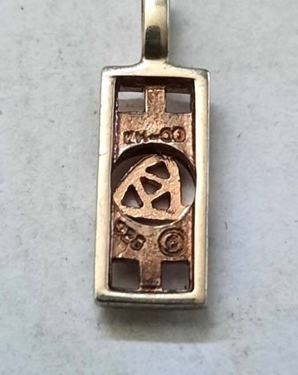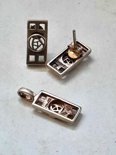 Deze set, bestaande uit een hanger en bijpassende oorbellen, is uitgevoerd in de verfijnde stijl van Charles Rennie Mackintosh.