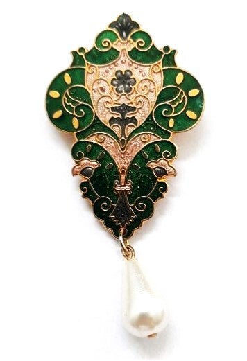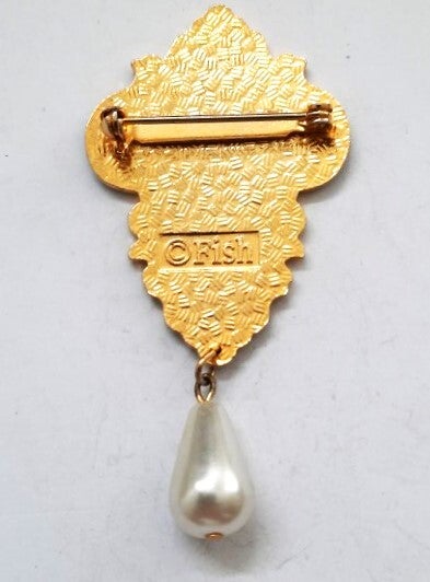De broche is versierd met een sierlijke, hangende druppelparel.