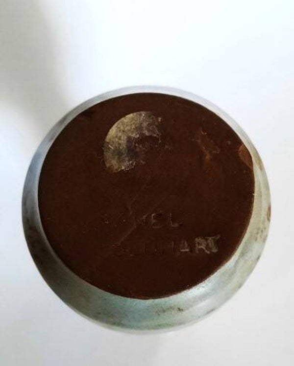 Vaasje cilinder met smalle hals Nel Goedhart.Gemerkt Nel Goedhart (Leiderdorp in 1937-Leiden 1975)16,0 x 5,3 cm.Klein flintje aan voet