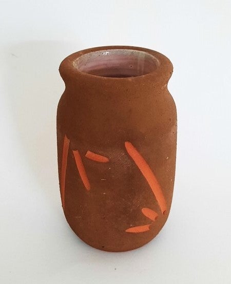 Het vaasje is gedecoreerd met haar kenmerkende ingekraste geometrische lijnenspel, ingevuld met een contrasterend oranje pigment.