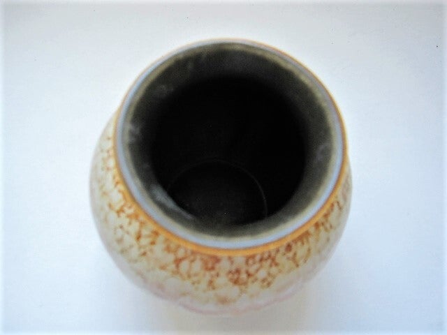 De vaas heeft een zeer fraai tweekleurig glazuur: een crème-witte basis met een karakteristiek bruin, gespikkeld druipglazuur op de schouder en hals.