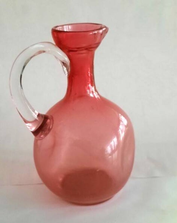 Het karafje heeft een dieproze/rode kleur die typisch is voor dit procedé, waarbij goudchloride aan het glas werd toegevoegd.