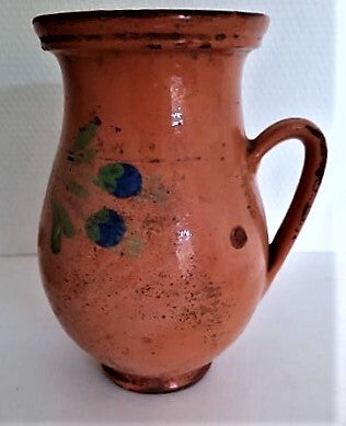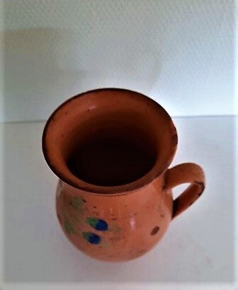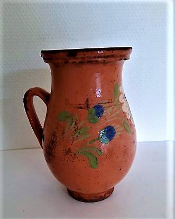 De kruik is een klassiek voorbeeld van Hongaars aardewerk, uitgevoerd in een warme terracotta kleur en gedecoreerd met de karakteristieke handgeschilderde blauwe en groene florale motieven (stippen/bloemen).