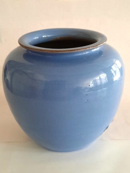 Een karakteristieke vintage bolvaas in een prachtige, diepe hemelsblauwe kleur glazuur met een bruin randje aan de bovenzijde.