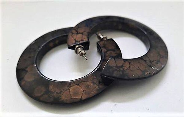 De oorbellen hebben een unieke gemarmerde look in warme bruin- en kopertinten, wat zorgt voor een stijlvolle en organische uitstraling.