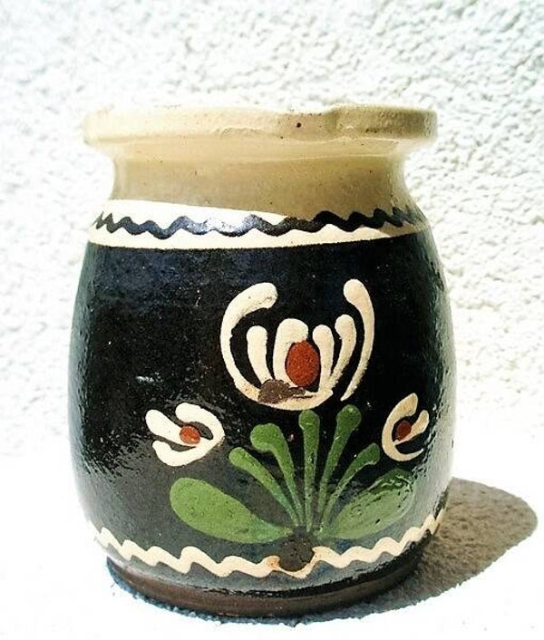 Een authentieke, antieke Hongaarse kruik/pot van geglazuurd aardewerk.