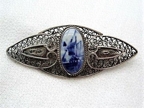 Antieke Filigrain zilveren broche Delfts Blauw met molen (6783-2335)