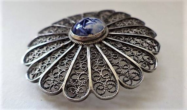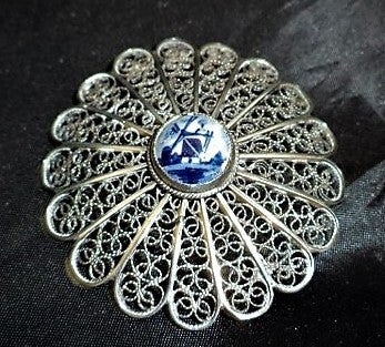 Grote antieke filigrain zilveren Delfts Blauwe broche (7251-3433)