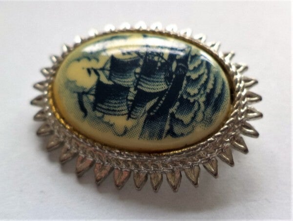 Het sieraad heeft een gedetailleerde blauwe afbeelding van een klassiek zeilschip (Clipper) op een crèmekleurige ondergrond, uitgevoerd in de karakteristieke "simulated scrimshaw" stijl.