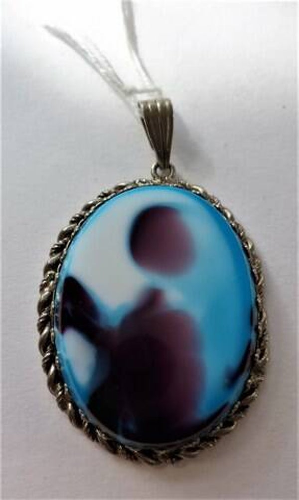 Pprachtige, grote vintage hanger met een artistiek patroon in blauw-, paars- en wittinten.