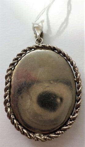 De steen (kunststof) is gevat in een zilverkleurige metalen rand met een stijlvolle, getorste bewerking.