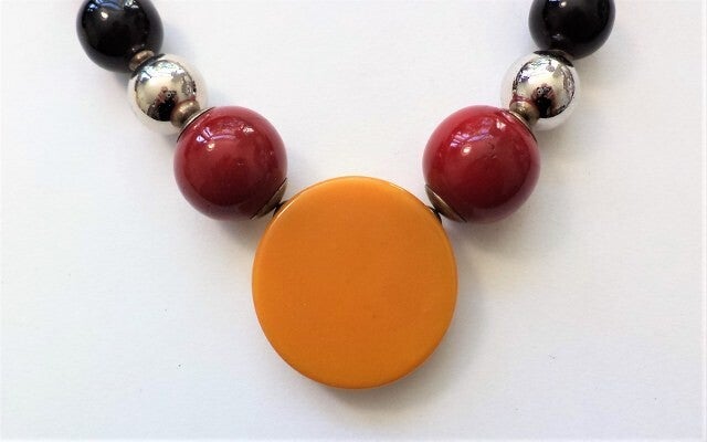 De ketting is uitgevoerd met geometrische elementen van galaliet in de krachtige kleurcombinatie rood, zwart en een opvallende gele centrale schijf.