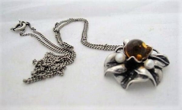 Stijlvolle zilveren Bloemenhanger (925) - Barnsteen & Parels & ketting (7711-970)