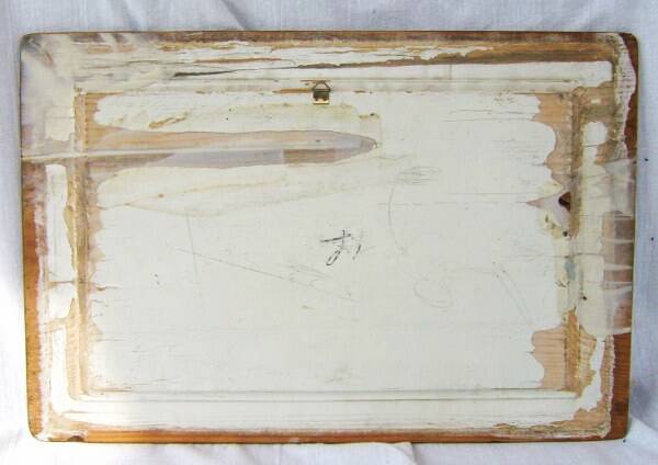 Het paneel is voorzien van een decoratieve beschilderde rand met klassieke motieven in de hoeken en een sierlijke inscriptie aan de onderzijde.