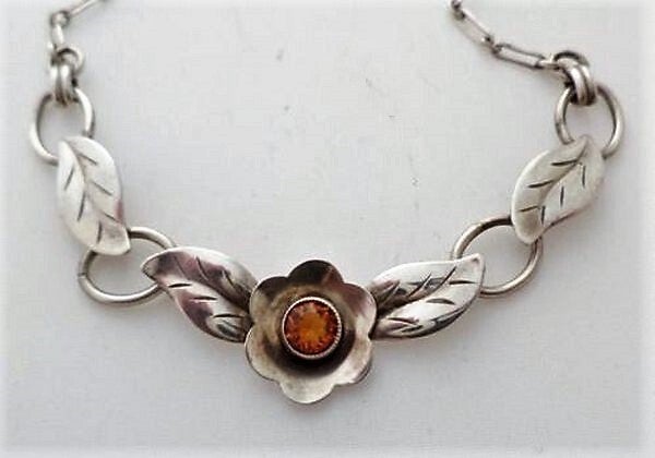 De bloem is bezet met een schitterende, briljant geslepen cognackleurige steen (vermoedelijk citrien) van 5 mm.
