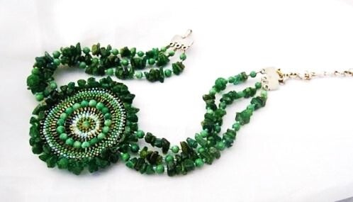 De ketting bestaat uit drie strengen van diverse soorten jade, die volledig op echt zilver zijn geregen.