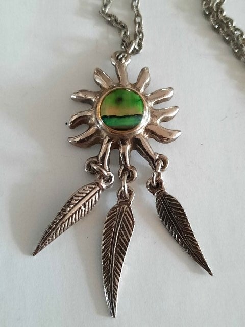 De hanger is voorzien van een opvallende groen-gestreepte steen (abalone mogelijk malachiet-look) en drie sierlijke, beweegbare veren aan de onderzijde.
